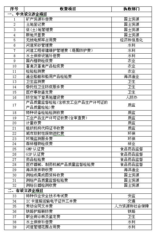 一、自2014年5月1日起,对全省范围内的所有企业免征32项中央设立、7项省设立涉企行政事业性收费的省级收入(详见附件)。
